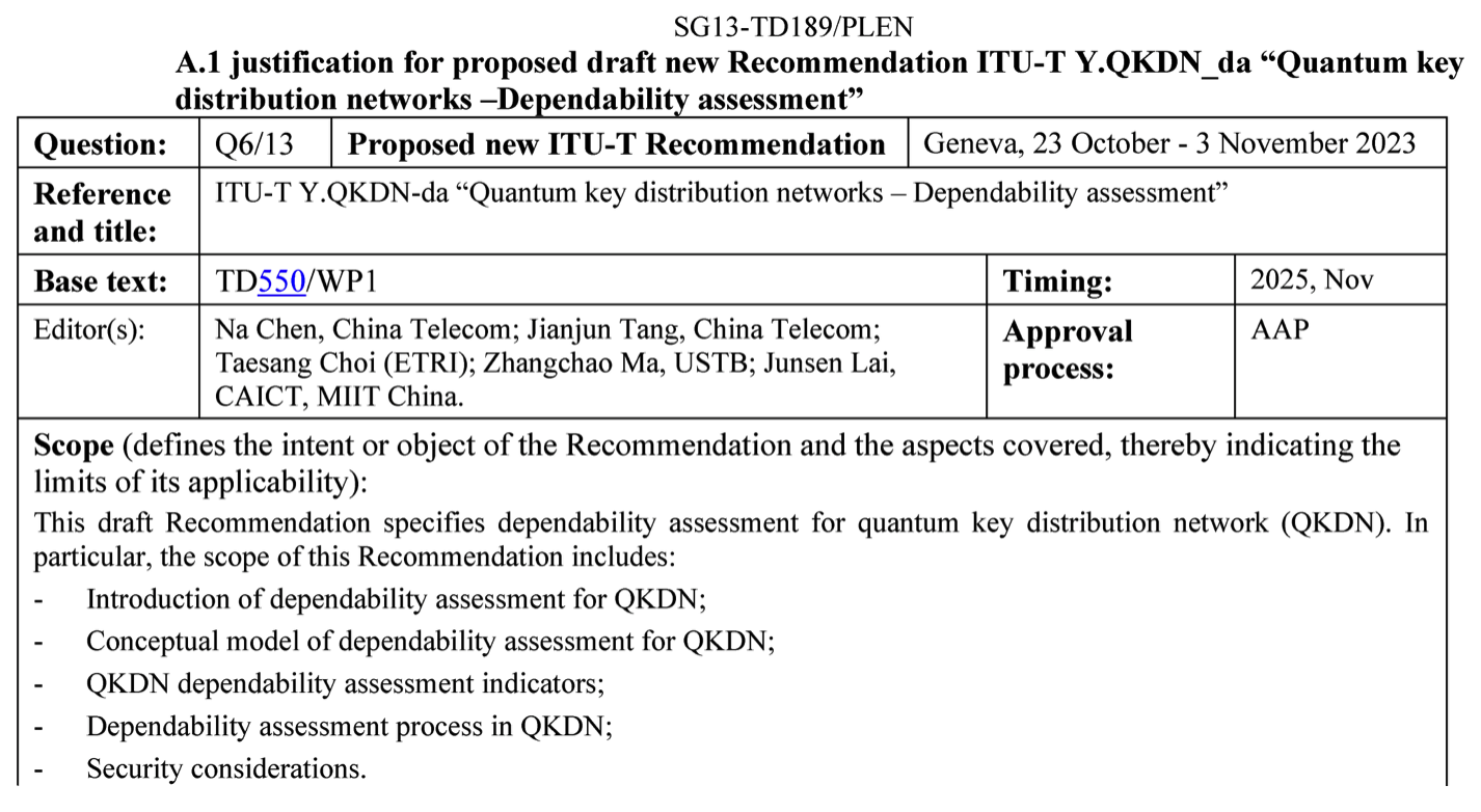 10月23日至11月3日,國際電信聯(lián)盟電信標準部門第13研究組(ITU-T SG13)全體會議在瑞士日內瓦召開。會上,由中國電信研究院牽頭的國際標準立項提案:ITU-T Y.QKDN-da: “Quantum key distribution networks – Dependability assessment” (量子密鑰分發(fā)網(wǎng)絡——可靠性評估)獲批立項。這是央企在推動量子通信網(wǎng)絡國際標準化過程中的首個重要成果。