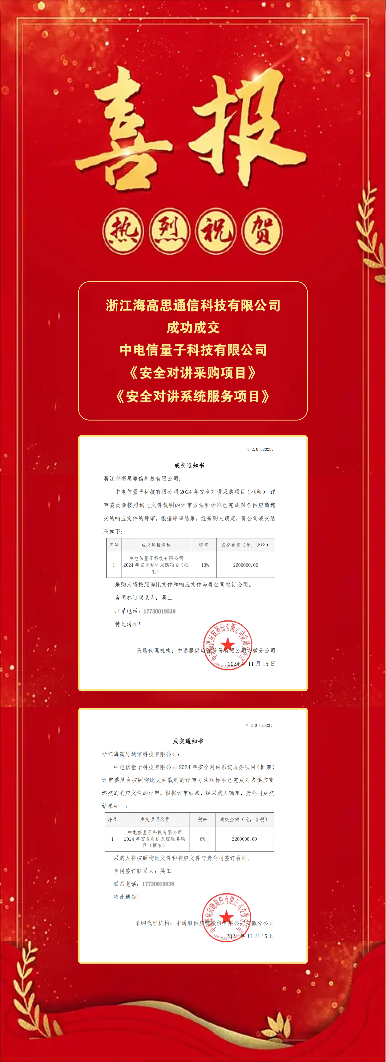 喜報!我司成功成交中電信量子科技有限公司對講采購項目